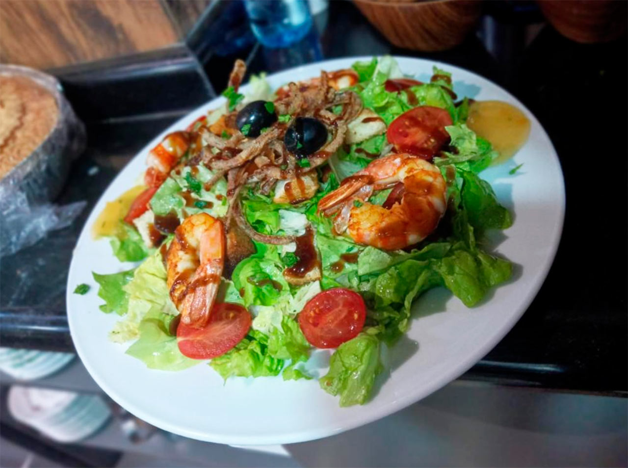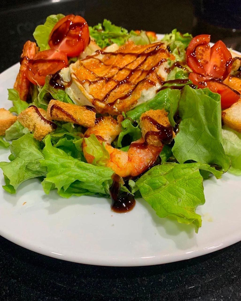 Templada€ 10,00Langostinos, queso de Cabra, tomate Cherry, picatostes y lechuga