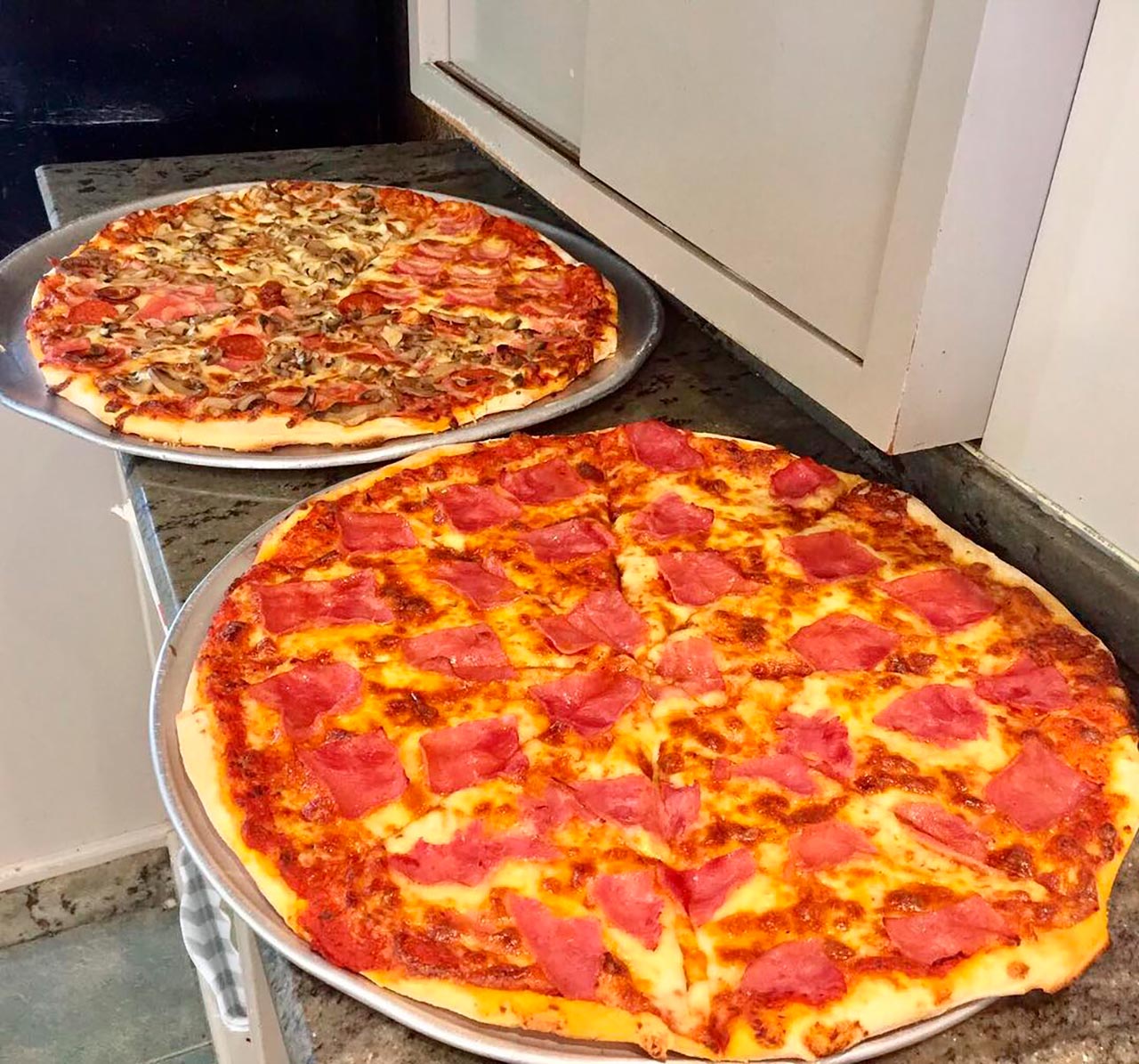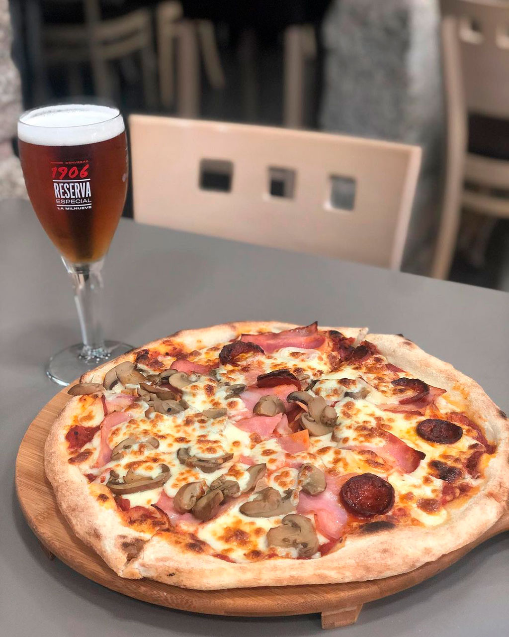 MontanaTomate, queso, jamón, cebolla y champiñones. 9,50€/17€/25€