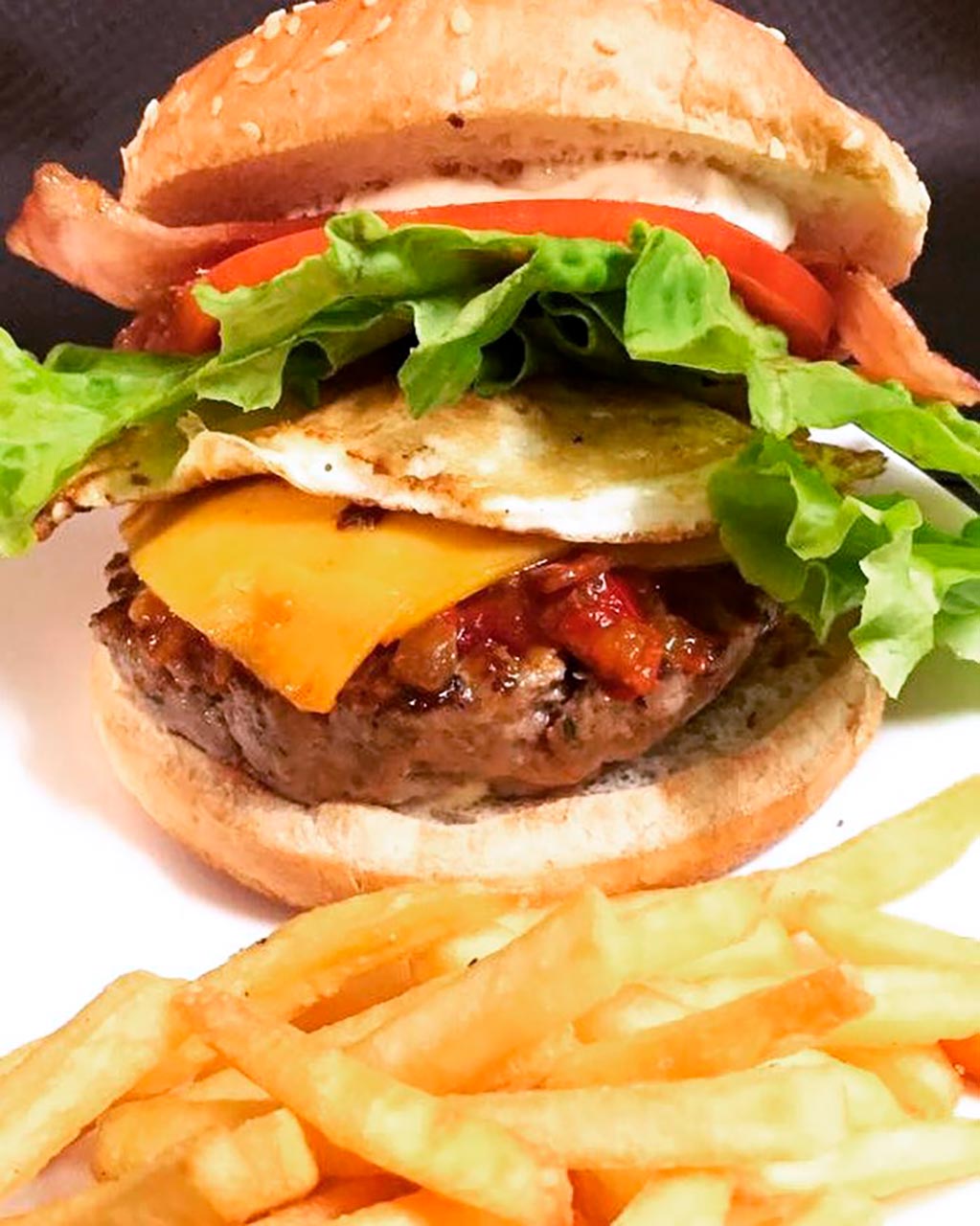 Nº7 Lomo fresco, bacon, 2 huevos fritos y patatas fritas€ 8,40
