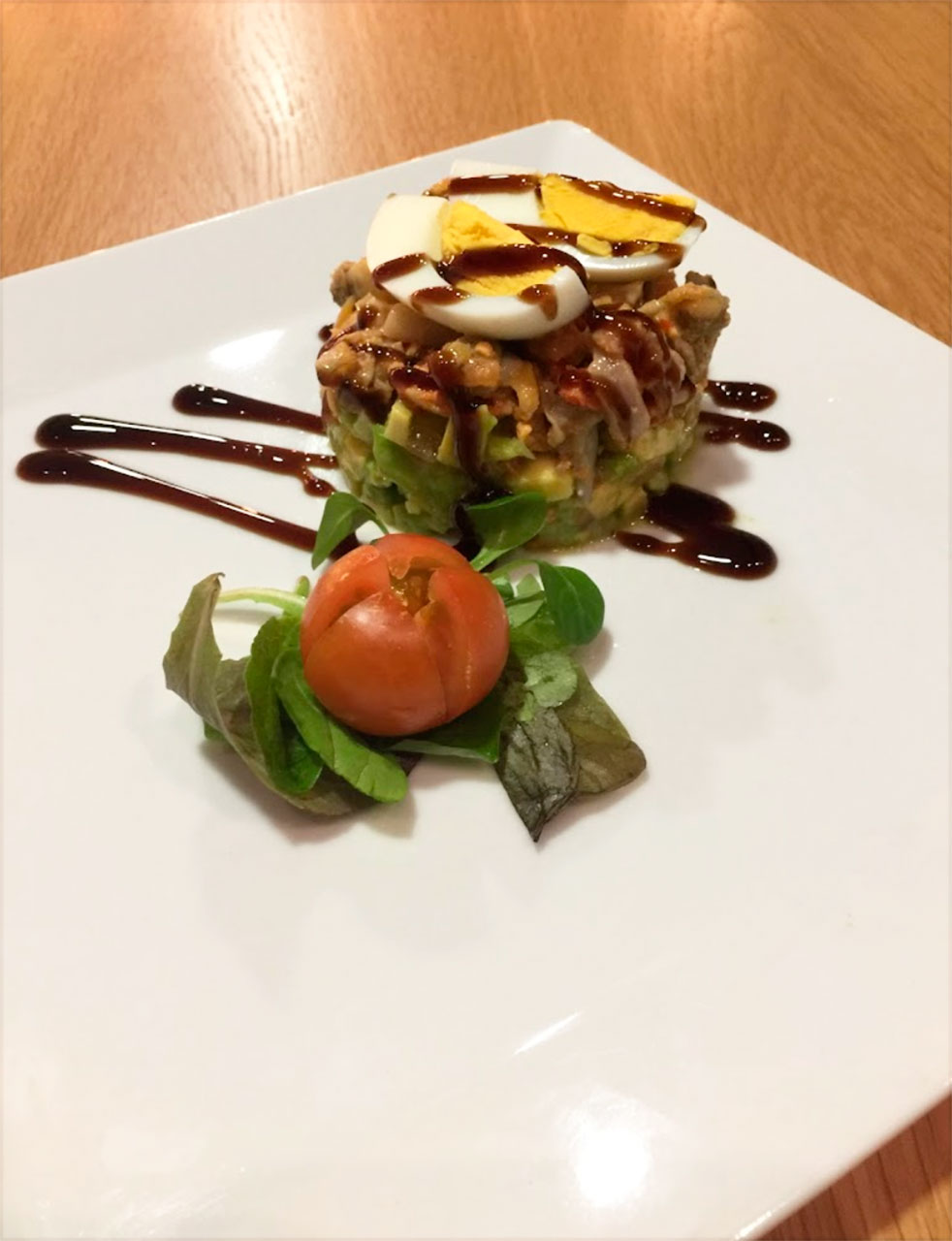 Ensalada Alquimia€ 12,50Lechuga, tomate, cebolla caramelizada, nueces, rulo de cabra y bacon.