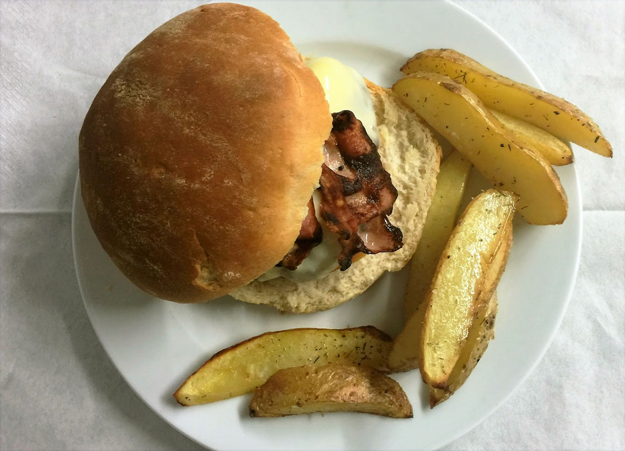 Hamburguesa de ternera 100%€ 10,50180 gr. de carne, queso, cebolla, lechuga y tomate con patatas fritas.