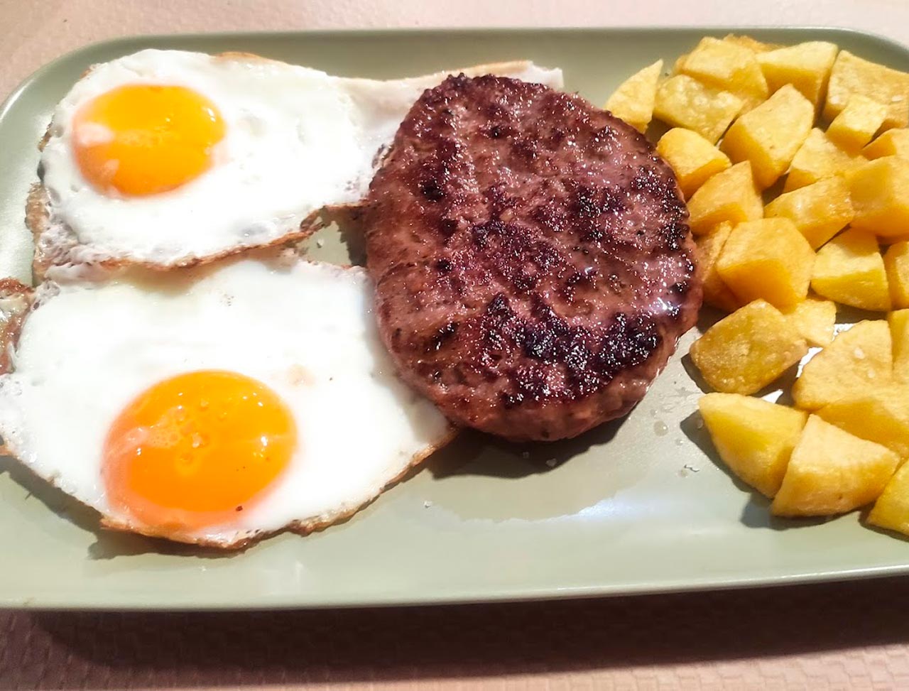 Hamburguesa de ternera con huevo y patatas€ 6,95