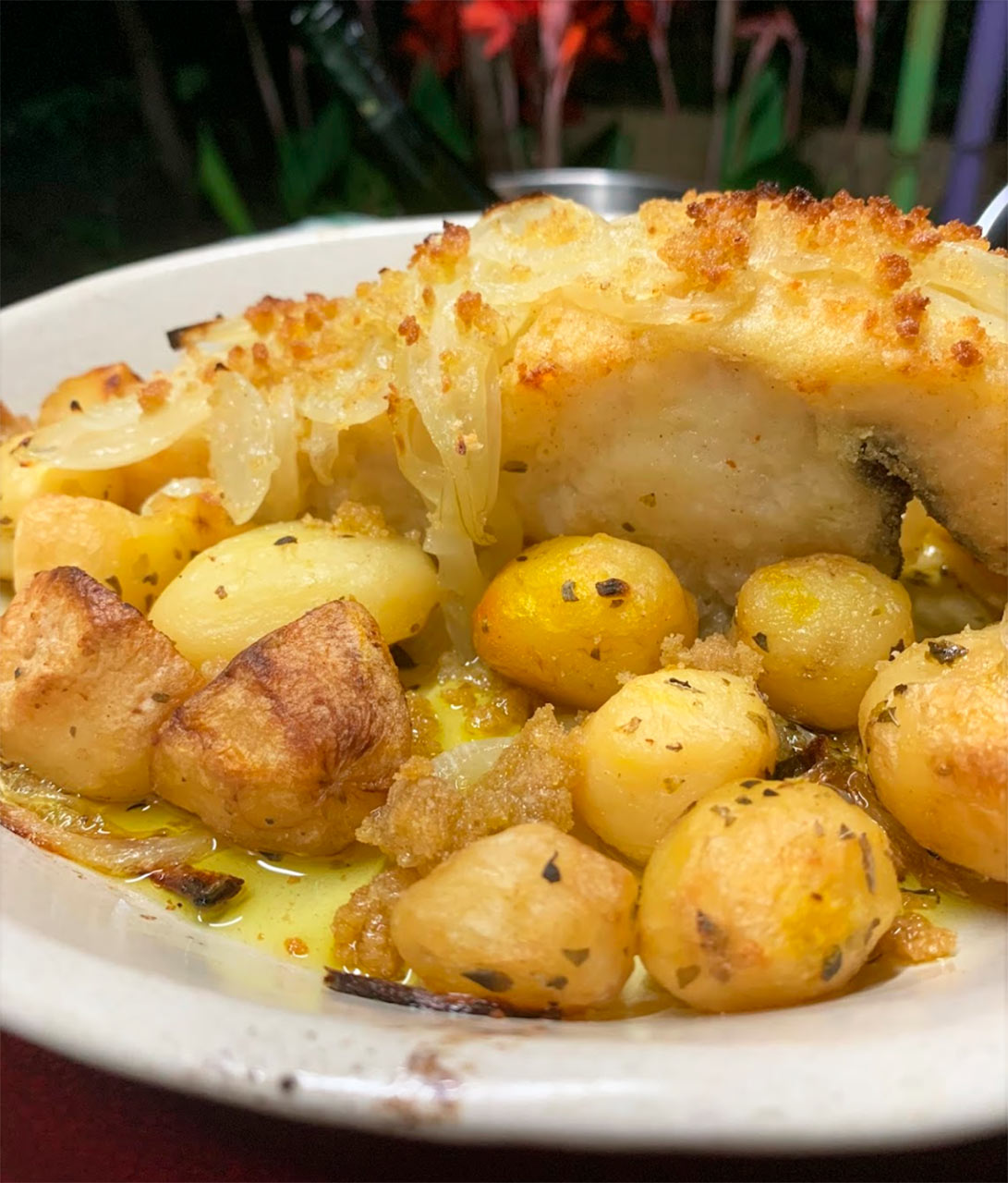 Pollo campero confitado con ciruelasGuarniciones: puré de patata trufada o patata paja. Saquito de verduras.
