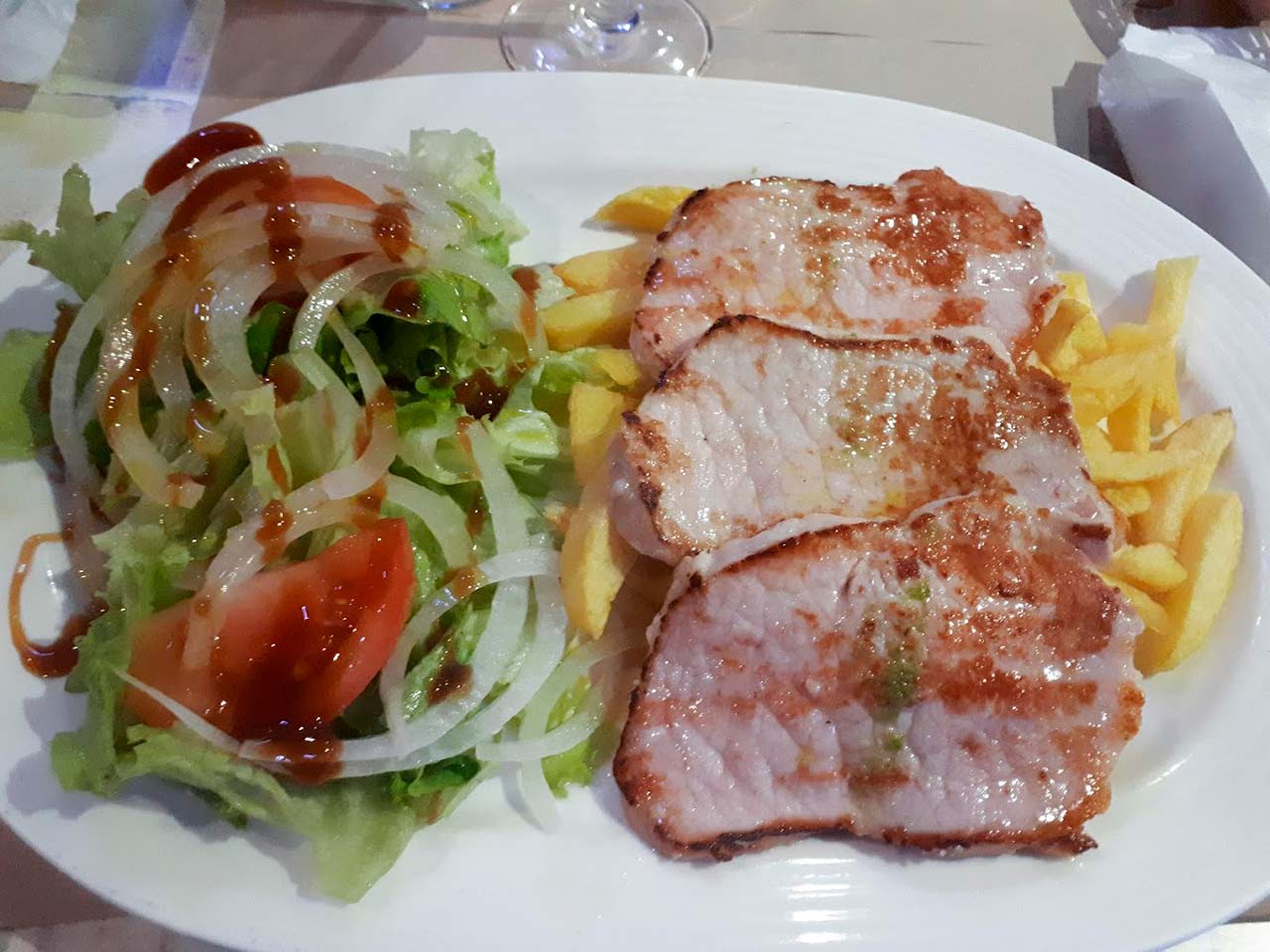 Lomo de cerdo, ensalada y patatas fritas€ 10,00