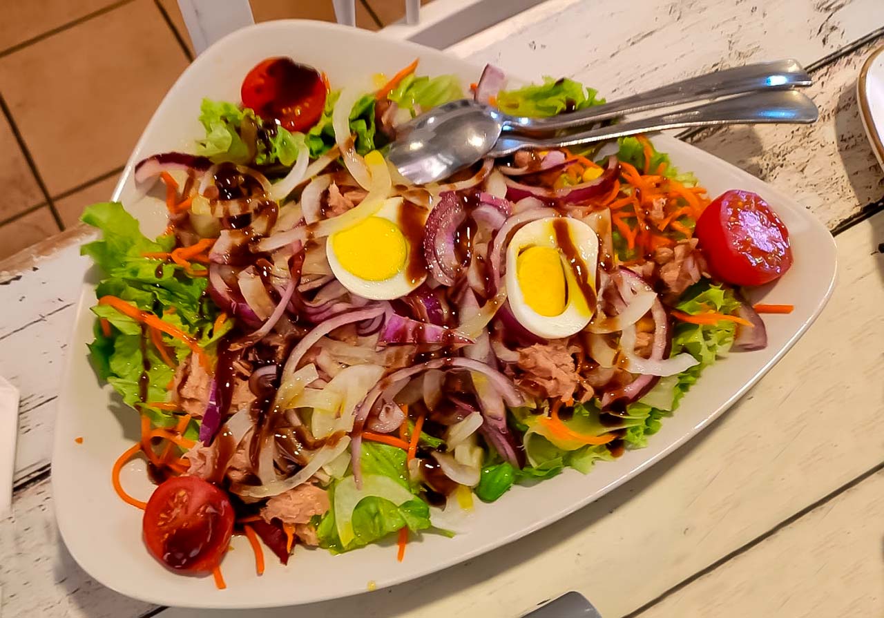 Merluza a la plancha, ensaldaa y patatas fritas€ 11,00