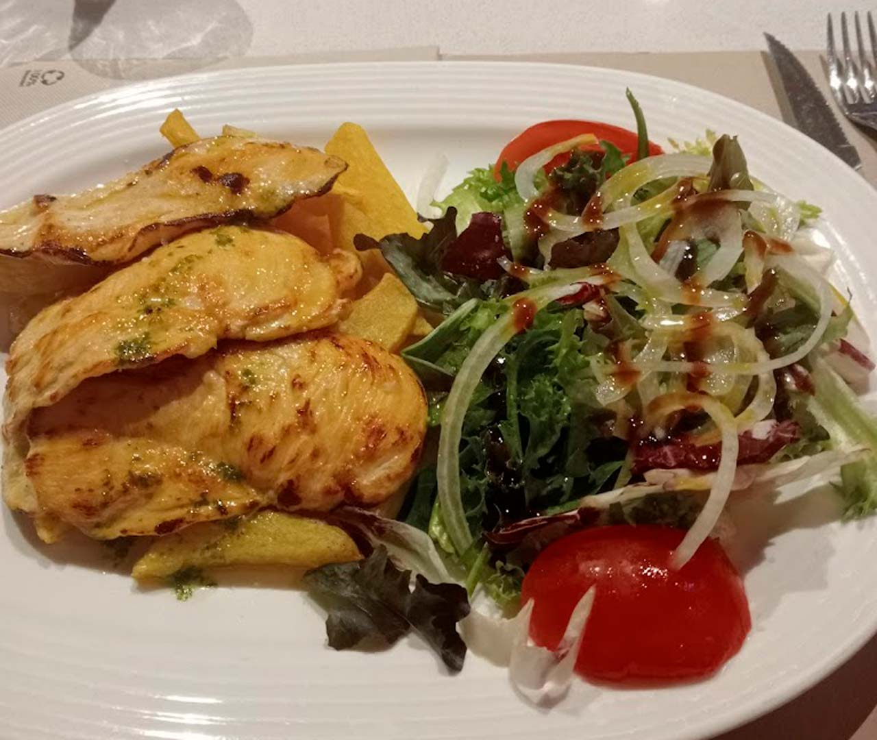 Pechuga de pollo, ensalada y patatas fritas€ 9,00