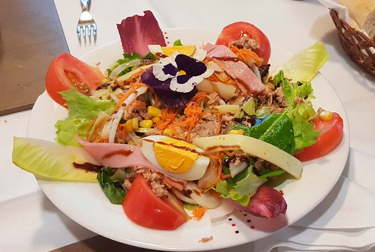 Ensalada tropical€ 7,00Palitos de cangrejo, queso, lechuga, piña, manzana y vinagre de Jerez