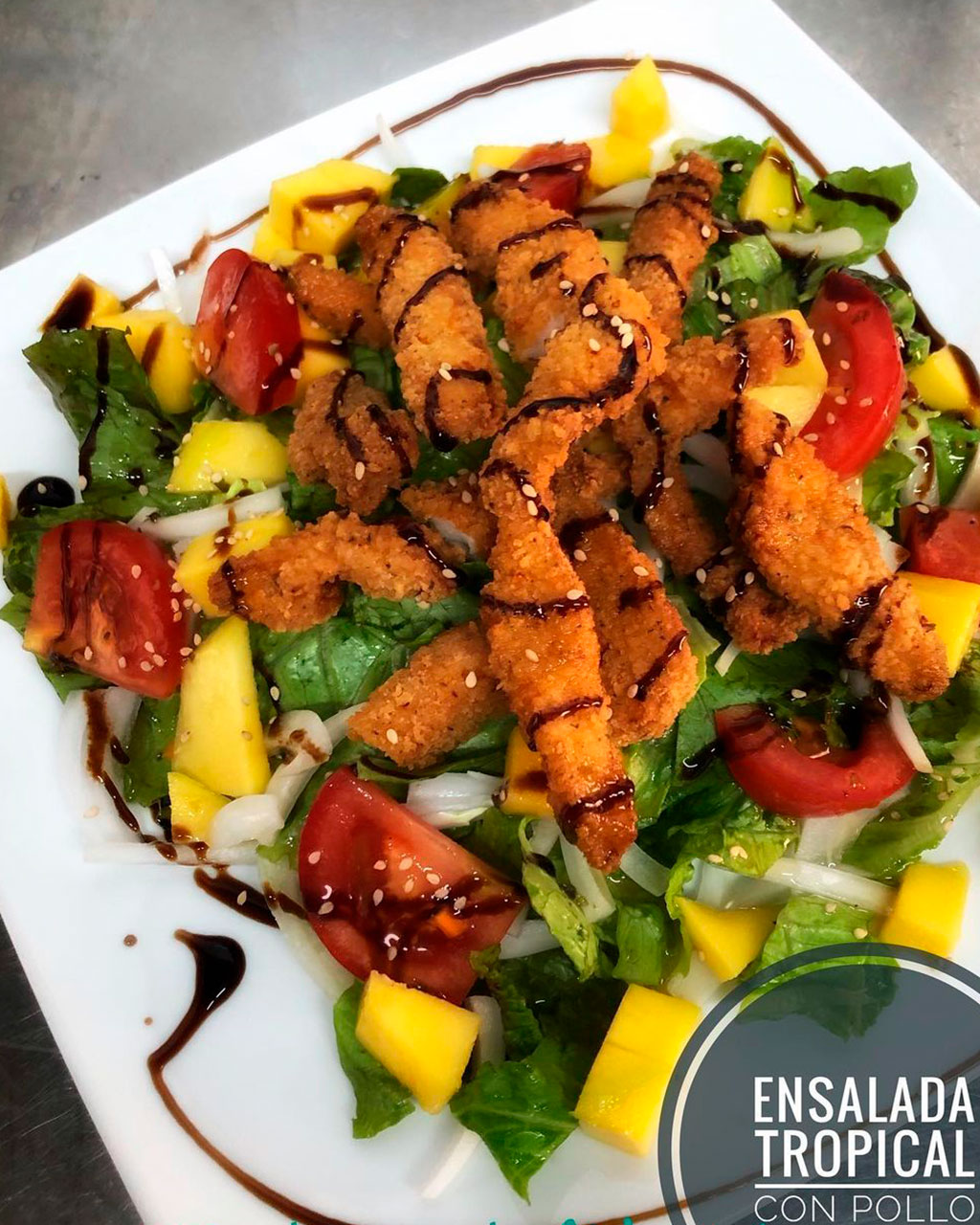 Ensalada de polloMezcla de lechugas, tiras de pollo, mango, cebolla y tomate con aderezo de aceto balsámico.