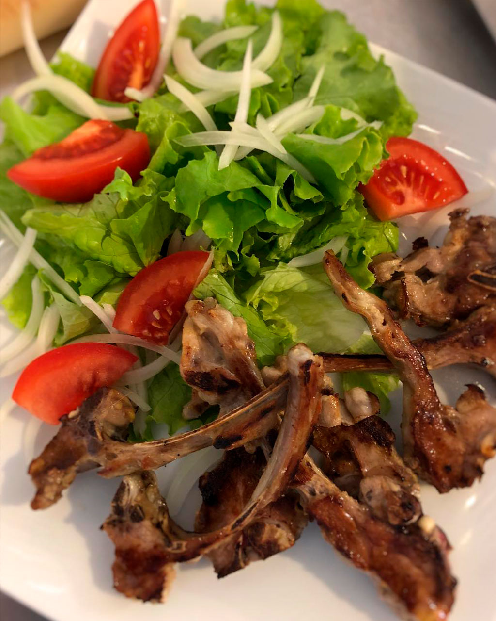 Ensalada de queso de cabraMezcla de lechugas, espinacas, tomate, cebolla, nueces, semillas de sésamo y queso de cabra con aderezo de limón.