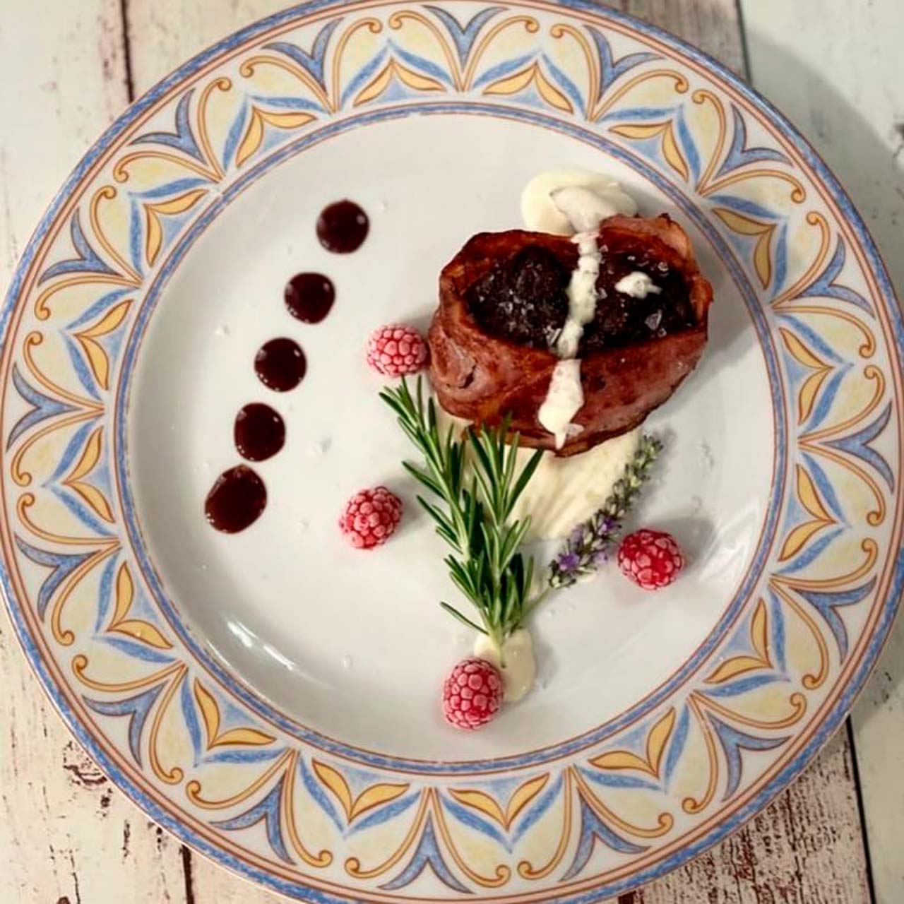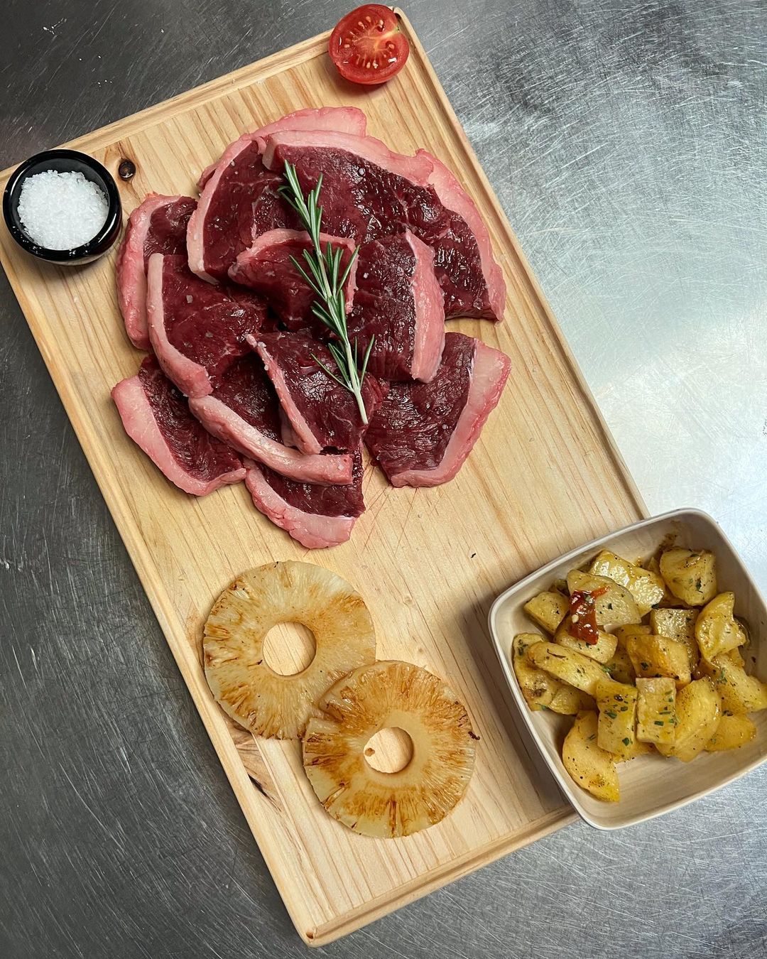 Posta de ternera fileteada1 kg aproximadamente Acompañado con patatas y guarnición de temporada.