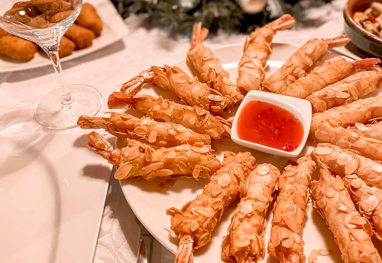 Crujiente de langostinos€ 12,80Con almendras laminadas y salsa sweet chili
