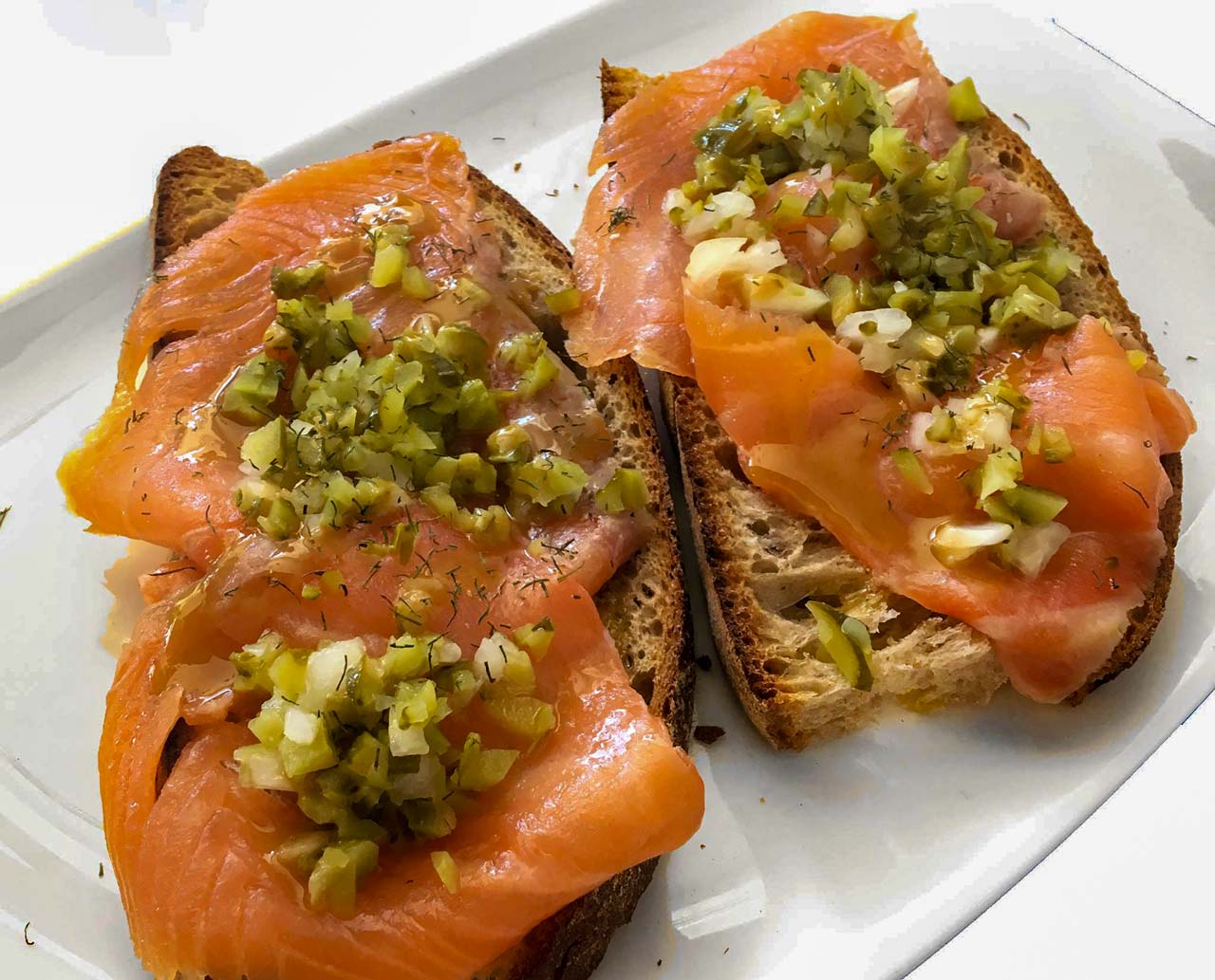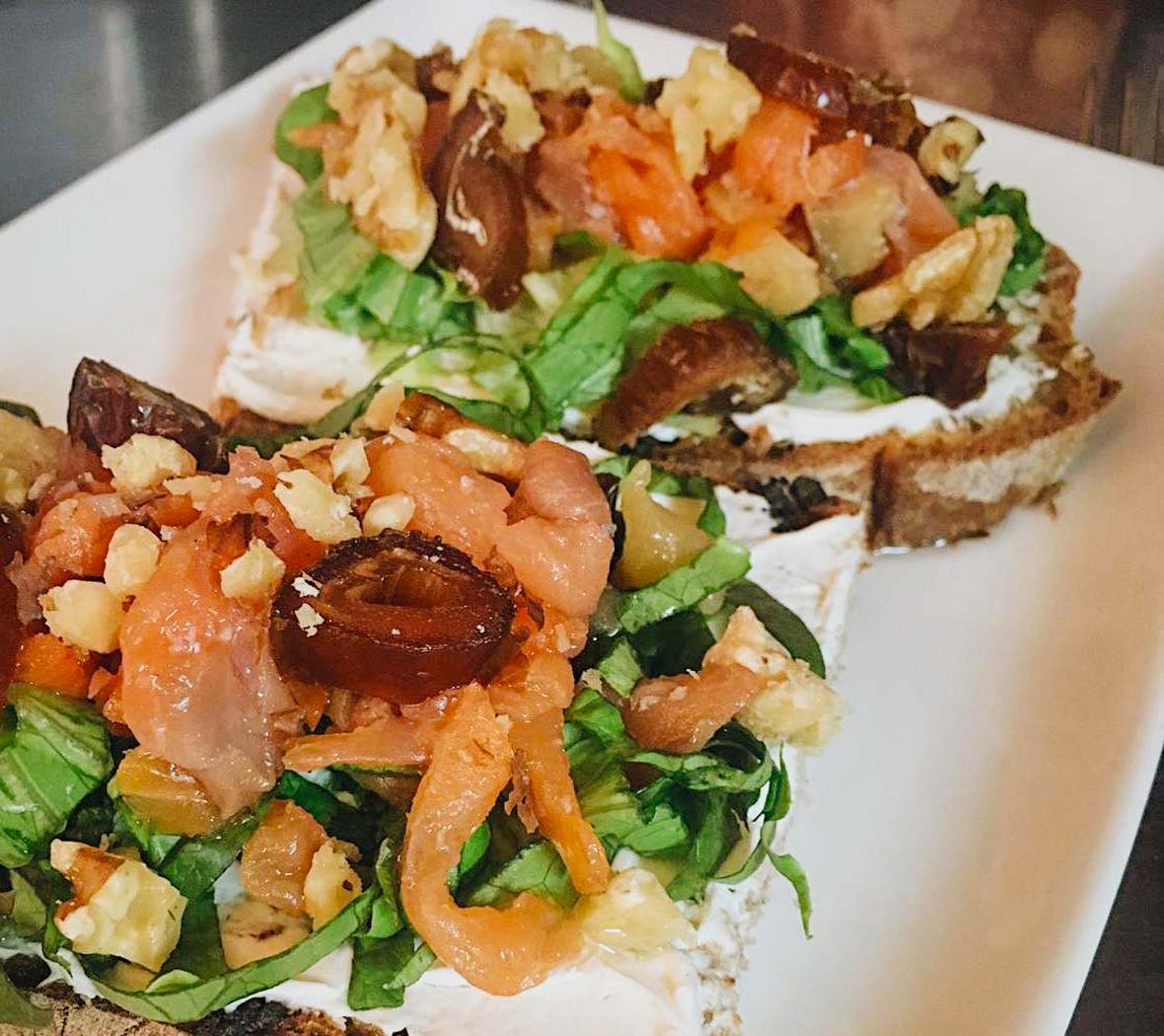 Tosta en pan de focaccia€ 9,30Con queso crema, salmón ahumado y alcaparras