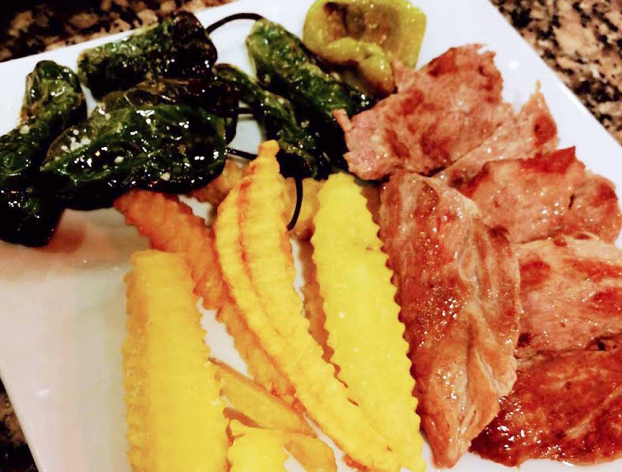 Capricho ibérico€ 15,00Solomillo ibérico, salsa de queso, jamón ibérico y patatas fritas