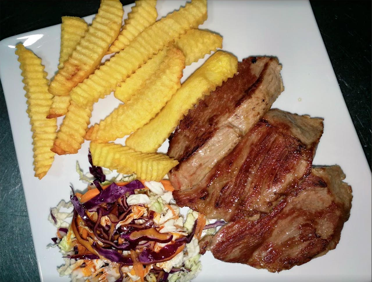 Hamburguesa de buey€ 7,50Hamburguesa de 250 grs, tomate, cebolla, queso y patatas fritas.