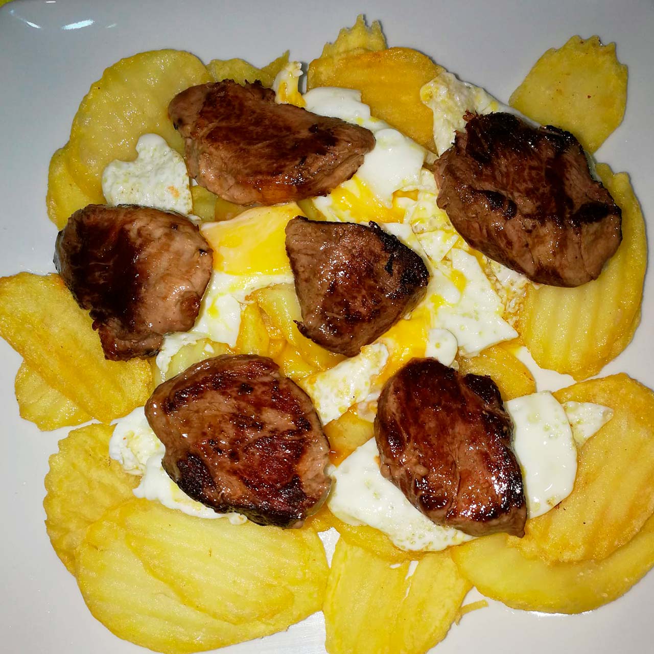 Huevos rotos con solomillo ibérico€ 12,00Huevos, solomillo ibérico y patatas fritas panaderas