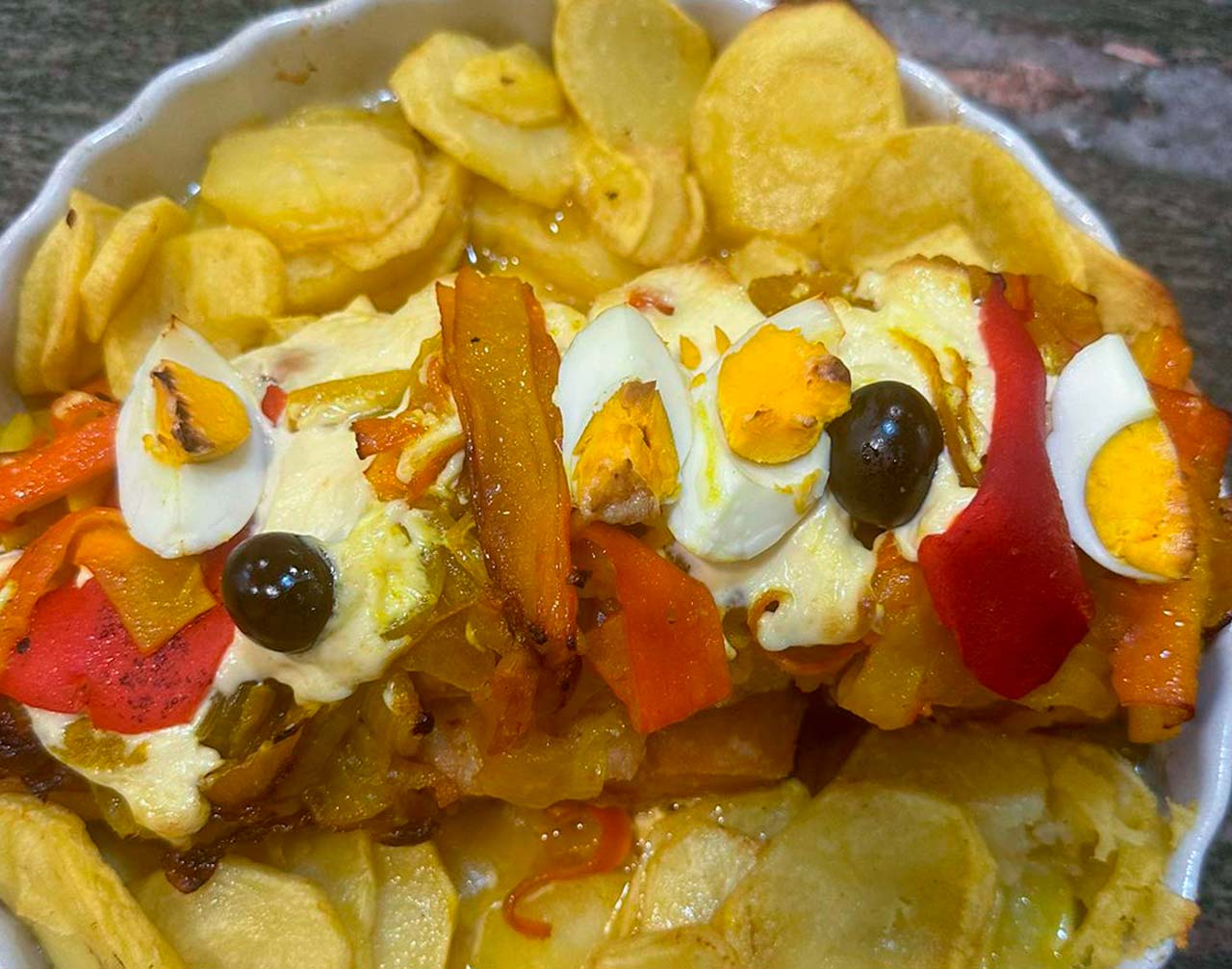 Bacalao Parrillada Pancho€ 22,50Especialidad de la casa: 1/2 kg de bacalao noruego gratinado al horno con patata rodaja, delicias del mar, jamón york, cebolla, huevo, pimiento rojo y olivas negras.