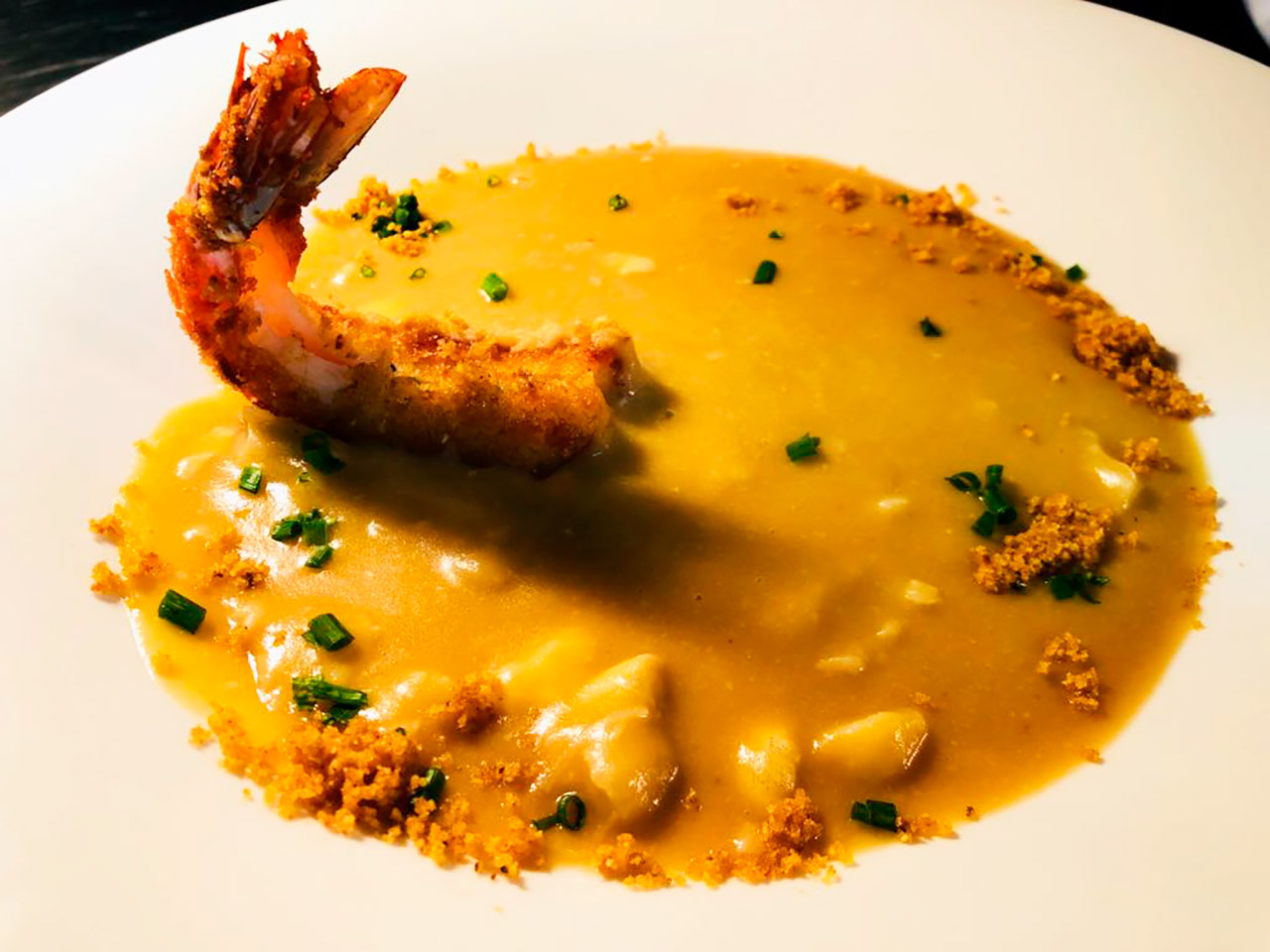 Sopa de Mariscos con sus crujientes de pan y langostinos