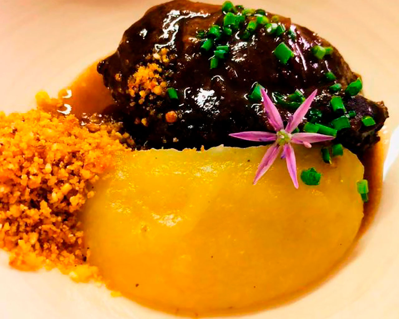 Carrilera de ternera gallega estofada al Mencía con cremoso de patata y espinacas salteadas
