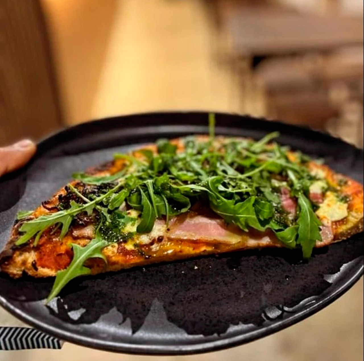 Alejandro€ 8,00Jamón serrano, tomate rallado, mozzarella, rúcula y salsa alioli