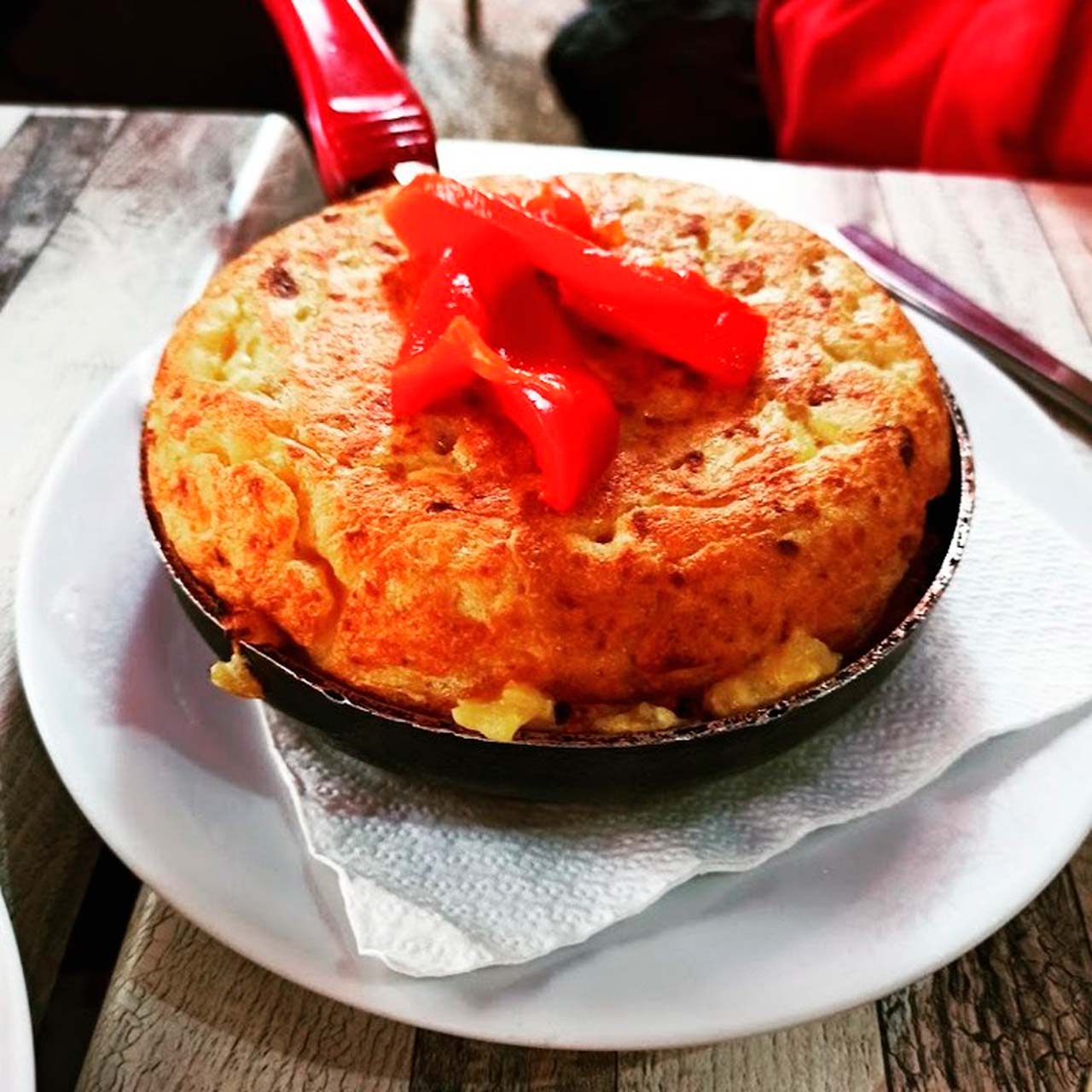 Huevos Rotos con Chistorra€ 12,00Huevos, patatas fritas, chistorra y bacon