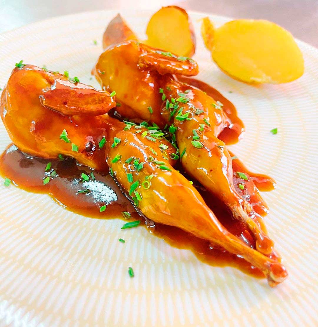 • Chupachups de codorniz con curry rojo y arroz jazmín
