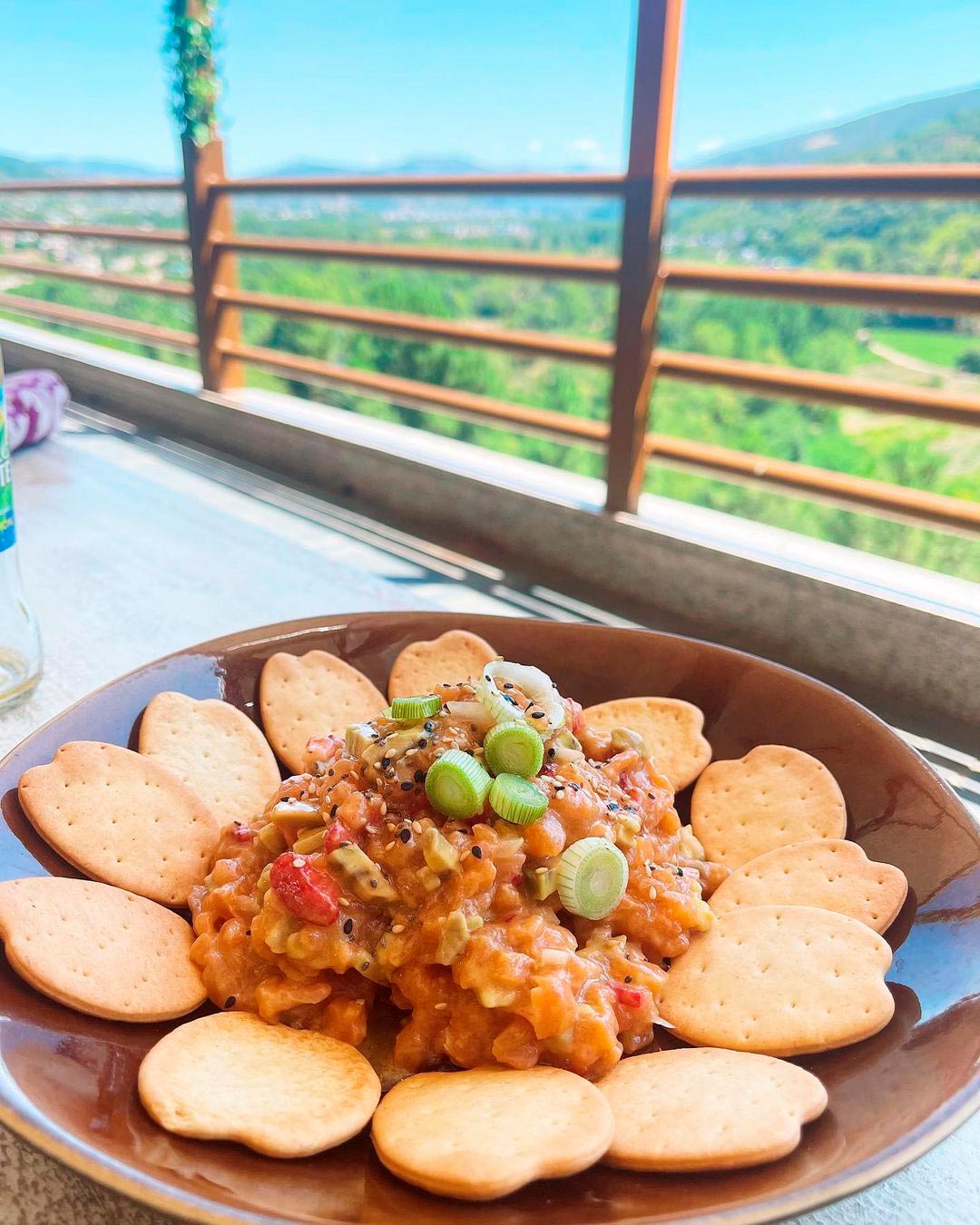 • Tosta de salmón, aguacate, y mantequilla de anchoas